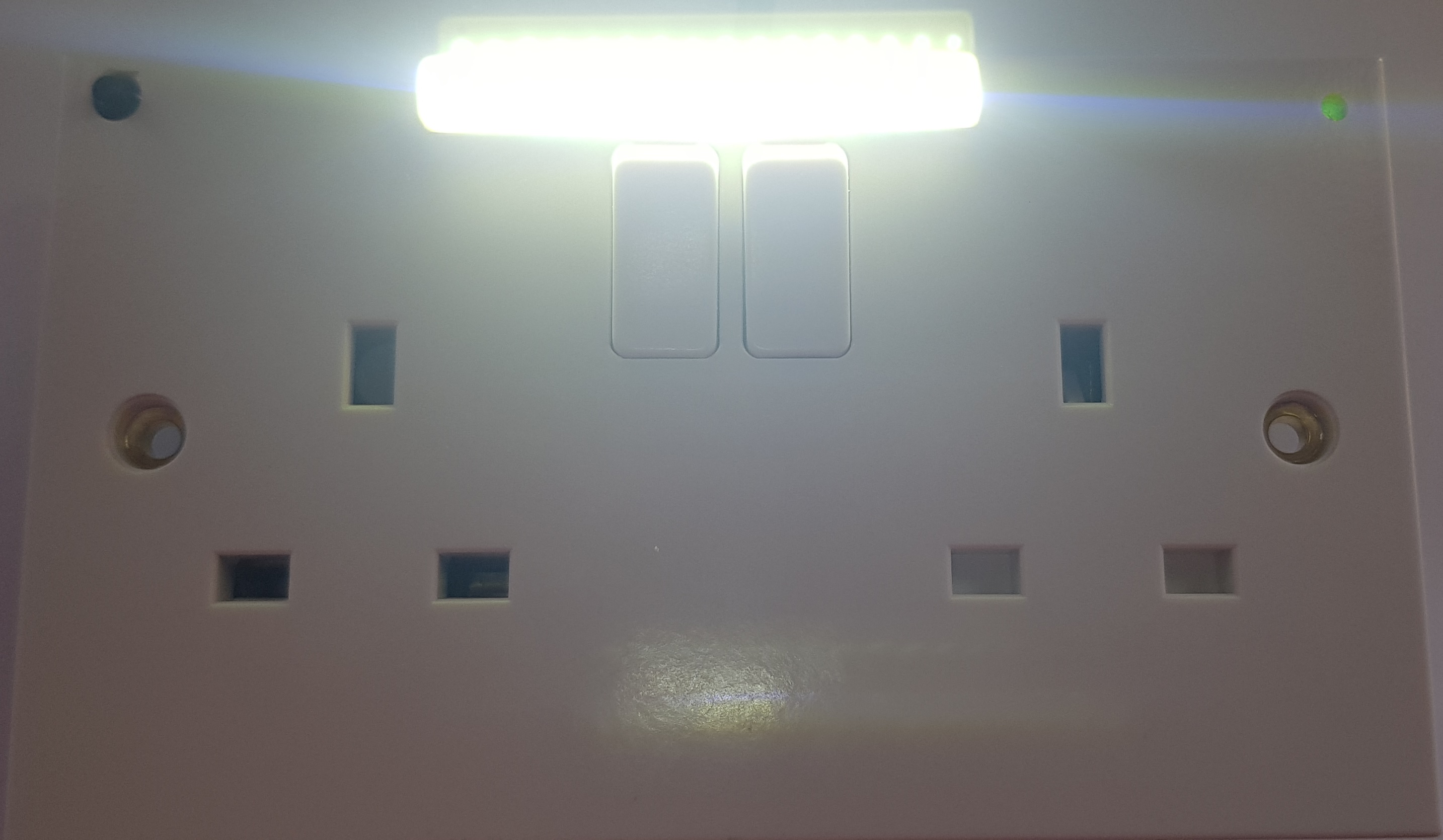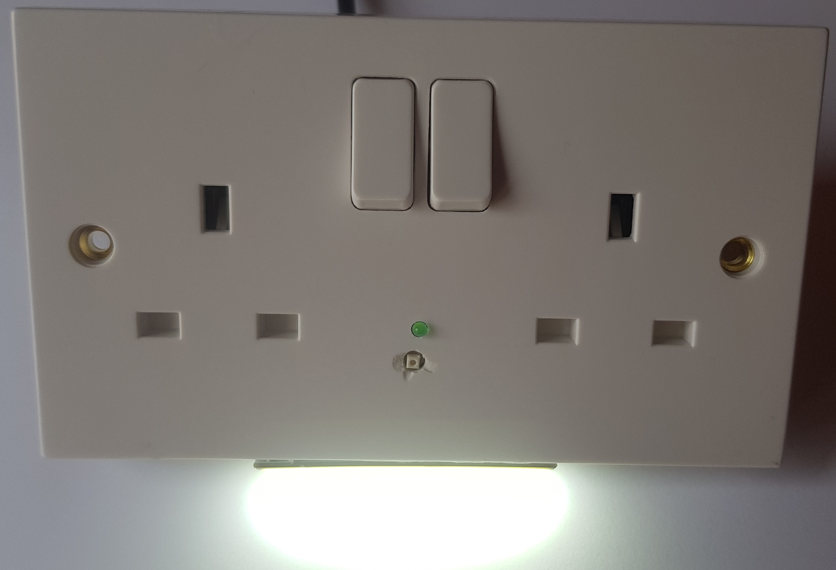 A plug socket with embedded emergency lighting, on the front of the plug socket. These are low voltage long-lasting LEDs that will illuminate when the mains electrical supply is removed.