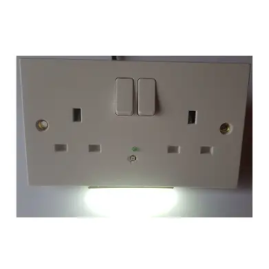 A plug socket with embedded emergency lighting, on the front of the plug socket. These are low voltage long-lasting LEDs that will illuminate when the mains electrical supply is removed.
