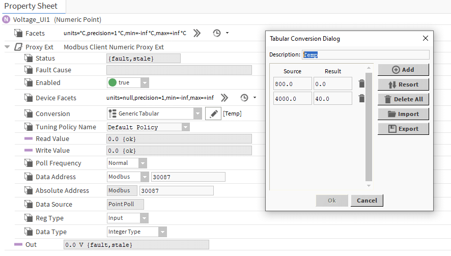 In the following example, I have converted the linear signal from a 4-20mA temperature sensor into degC. The iSMA modules are reading mV which is why I have filled the Source field with mV values.