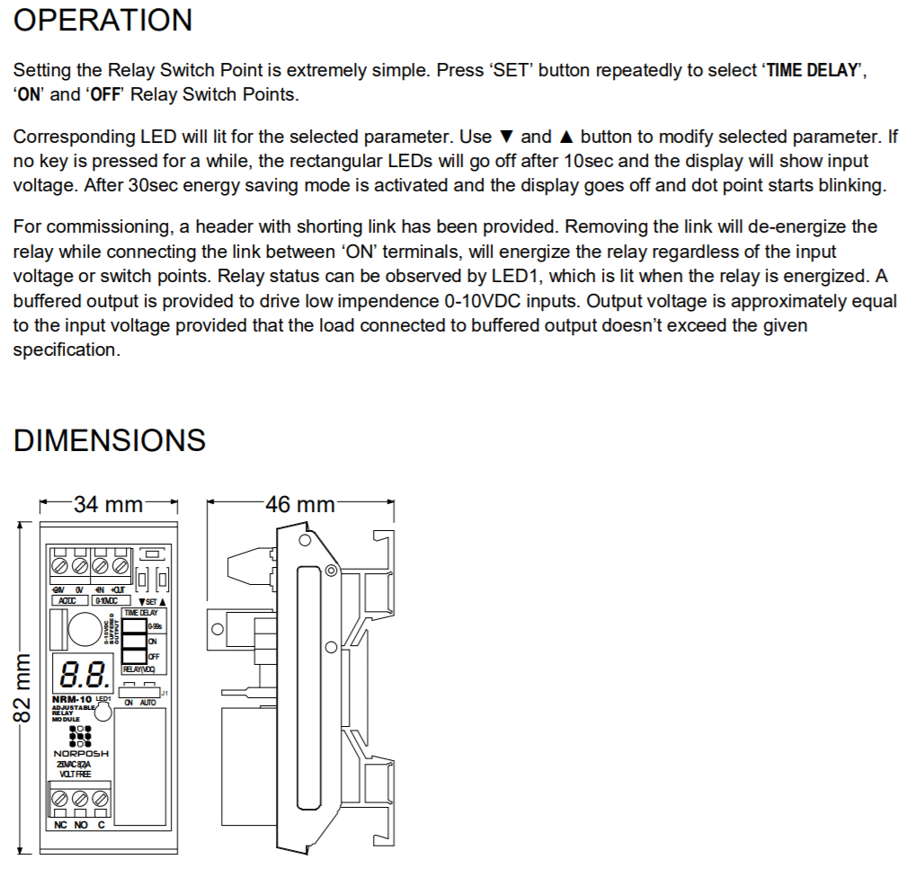 For commissioning, a shortened link header has been provided. Removing the link will de-energise the relay while connecting the link between ‘ON’ terminals, which will energise the relay regardless of the input voltage or switch points. Relay status can be observed via LED1, which lights when the relay is energised. A buffered output is provided to drive low impedance 0-10VDC inputs. The output voltage is approximately equal to the input voltage, provided that the load connected to the buffered output doesn’t exceed the given