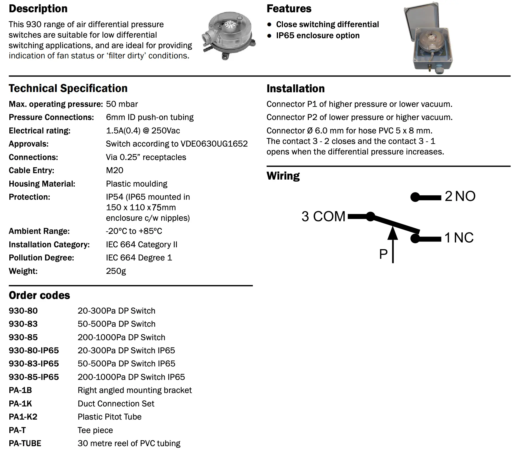 This 930 range of air differential pressure switches are suitable for low differential switching applications and are ideal for providing an indication of fan status or ‘filter dirty’ conditions.