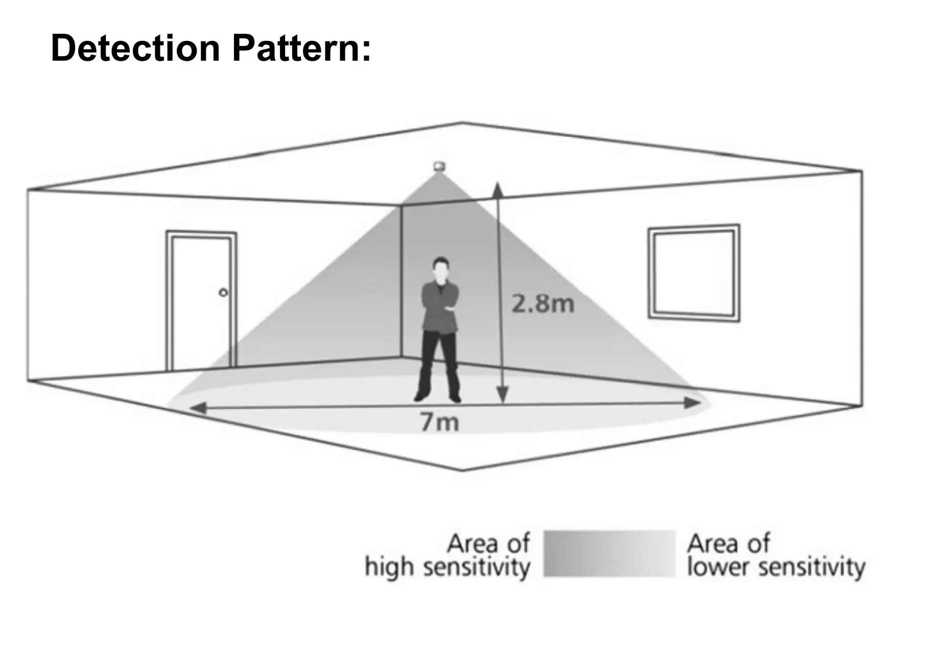 ● The detector should be sited so that the occupants of the room fall inside the detection pattern shown overleaf, at a recommended height of 2.8m on the ceiling. Note that the lower the sensor is installed the smaller the detection range will be, subject to the parameters shown on the diagram.