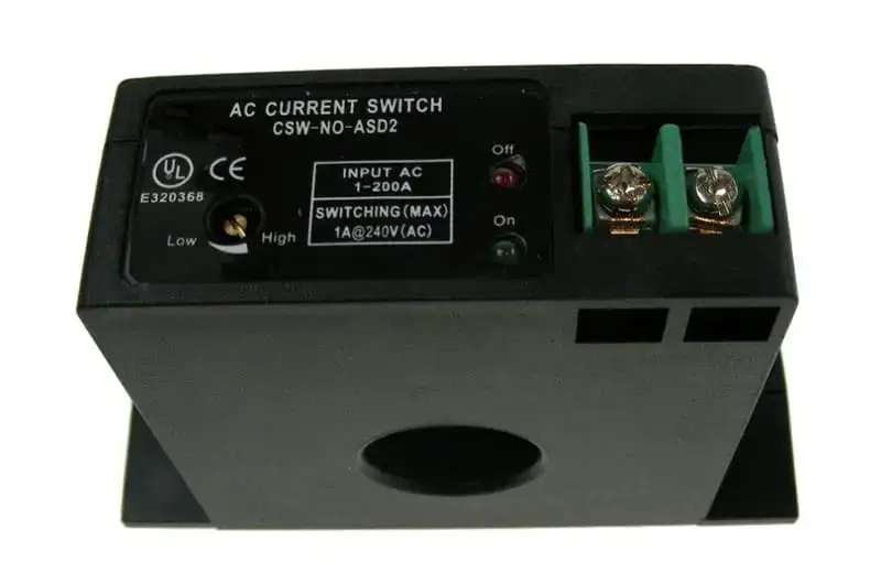 The CSW series of AC current switches activates a normally open (NO) contact closure via a solid-state switch whenever the monitored primary circuit current exceeds a pre-set level. Models are available to switch various load types, feature integral LEDs to indicate device power and also the switch status, and can be provided in solid or split-core configuration. The CSW-Axx models include a multi-turn adjustment to set the trip threshold to the desired value, and the CSW-Fxx models operate as a go/no-go status indicators with a factory set minimum threshold value. The switches can monitor up to 200 Amps continuously and feature an auto-range circuit to eliminate manual jumpers. All models are UL, CE, and RoHS compliant. The CSW series current switches are accurate, reliable, easy to install, and require less servicing than differential pressure switches, or flow switches.  The CSW series current switches can be used to monitor devices with a maximum continuous operating current of up to 200 Amps and the power supply is induced from the conductor being monitored.