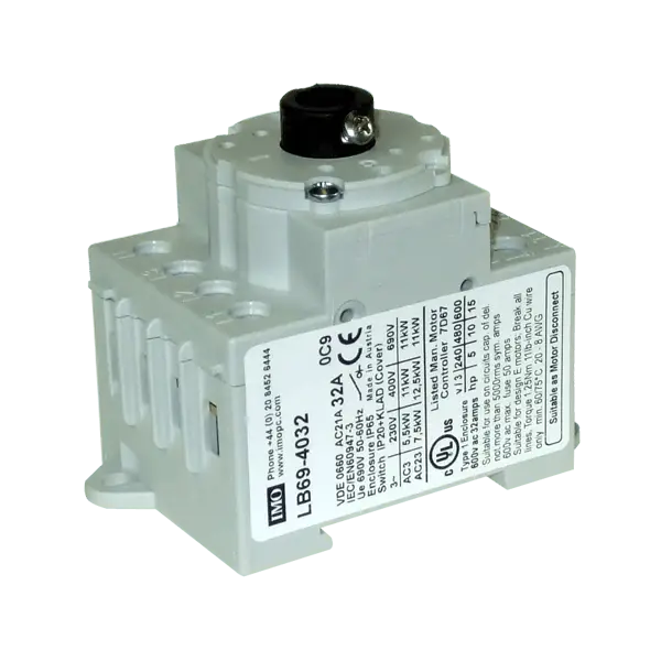A range of door lock Isolators from IMO. Sizes are available from 20A to 100A. Isolator, Handle, and Shaft are supplied as separate parts.