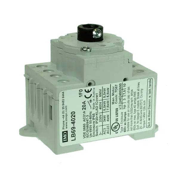 A range of door lock Isolators from IMO. Sizes are available from 20A to 100A. Isolator, Handle, and Shaft are supplied as separate parts.