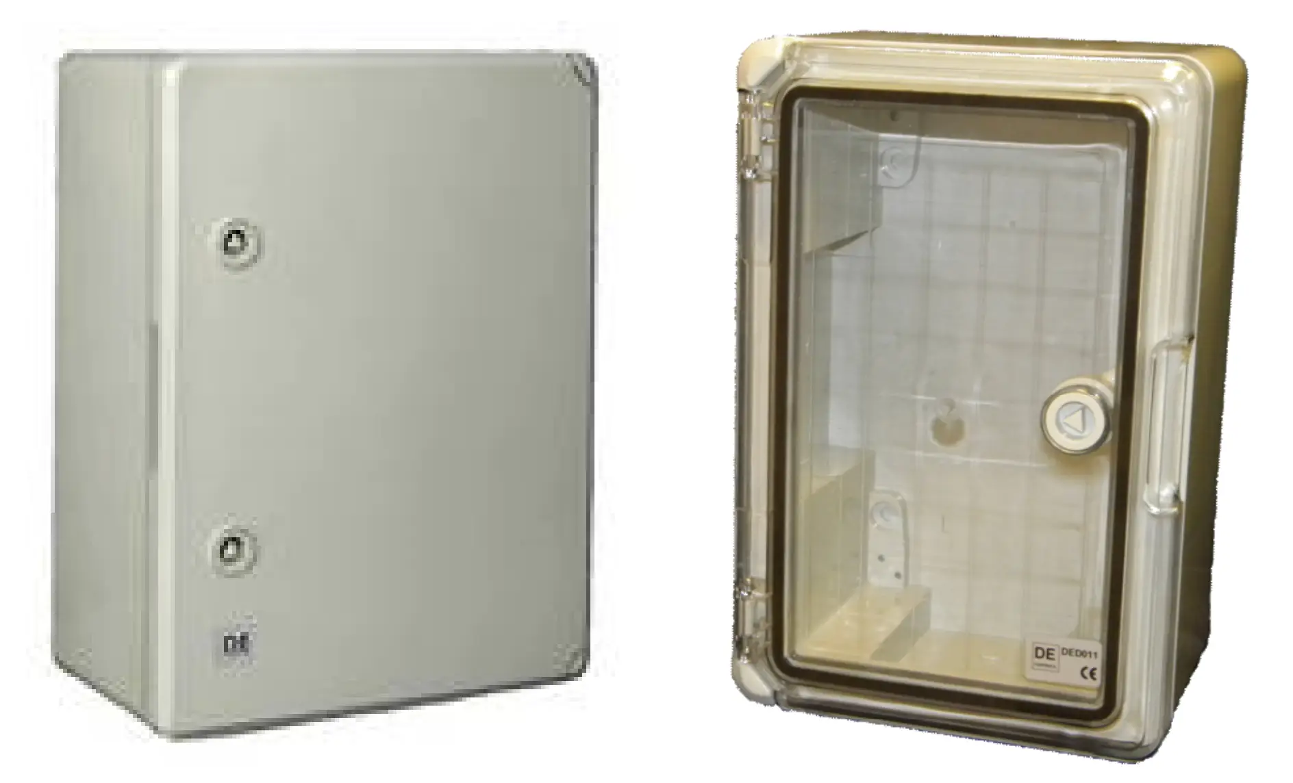 Hinged Door Enclosures are made from ABS HB material to the IP65 standard and comes complete with a steel back plate, mounting wall brackets, and lockable keys.