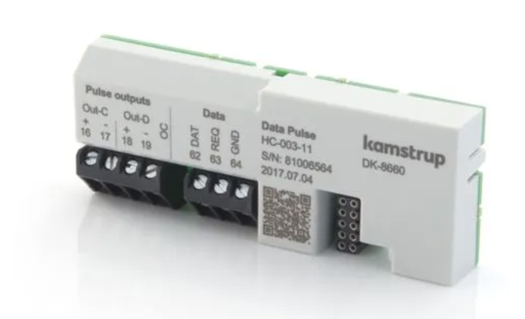 The Data Pulse communication module enables the Kamstrup Multical® 403 heat meter to be hard-wired to other on-site communication equipment for automatic data reading from the meter. This module has two configurable pulse outputs, Out-C and Out-D, suitable for pulsing selected registers from the Multical® 403.
