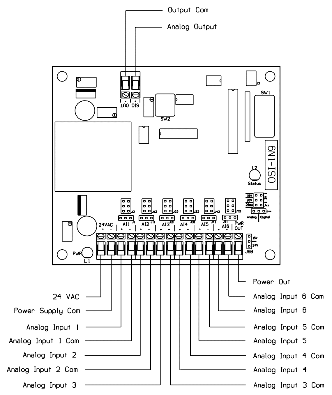 The IO6N1 is a microprocessor-controlled interface designed to provide maximum flexibility with a minimum cost. With a variety of standard inputs, the IO6N1 enables the user to interface several devices to the analogue output. The IO6N1 can average two to six inputs, output the highest or lowest of two to six inputs, or output the difference of two inputs. Input ranges are jumper-selectable, and all modes and analogue outputs are DIP-switch selectable. The output signal is optically isolated from input signals. The IO6N1 also accepts up to 6 digital inputs (binary sequence) and outputs a proportional analogue signal. The power output terminal can be used for power if the inputs are only contact closures.