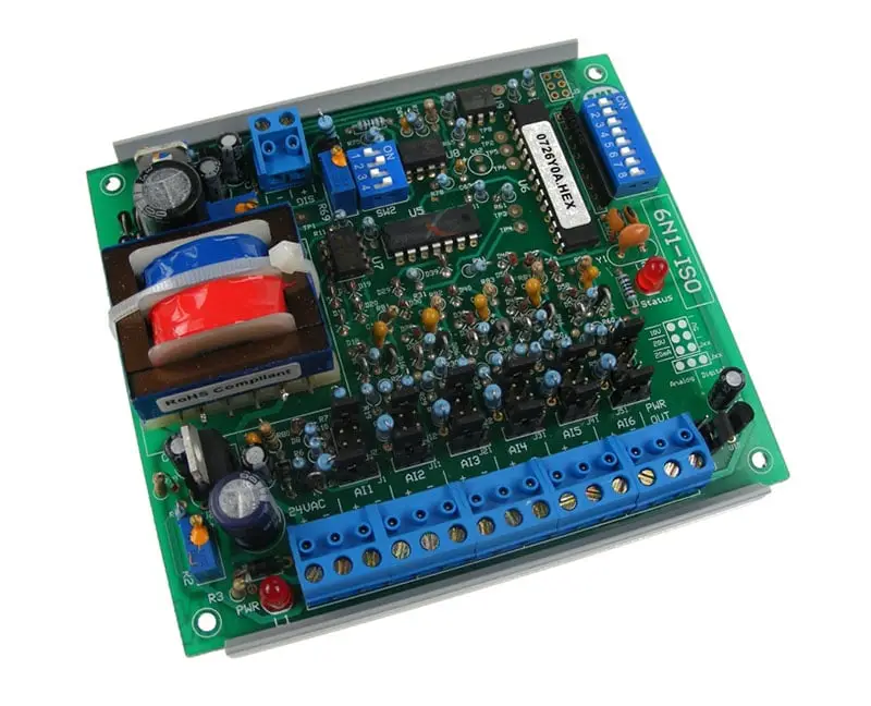 The IO6N1 is a microprocessor-controlled interface designed to provide maximum flexibility with a minimum cost. With a variety of standard inputs, the IO6N1 provides the user with the ability to interface several devices to the analog output. The IO6N1 can average two to six inputs, output the highest of two to six inputs, output the lowest of two to six inputs, or output the difference of two inputs. Input ranges are jumper selectable and all modes and analog output are DIP switch selectable. The output signal is optically isolated from input signals. The IO6N1 also accepts up to 6 digital inputs (binary sequence) and outputs a proportional analog signal. The power output terminal can be used for power if the inputs are only contact closures.