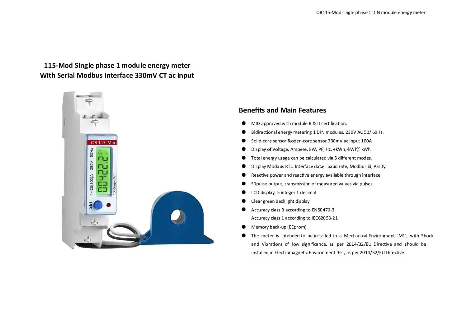 The OB115-MOD (EM115 known as GivEnergy) is a single phase Modbus energy meter with CT clamp, which can be used for direct metering up to 100A. Ideal for PV energy metering, this product offers bi-directional energy measurement and direct/CT connection. The meter features an LCD display with a clear green backlight.