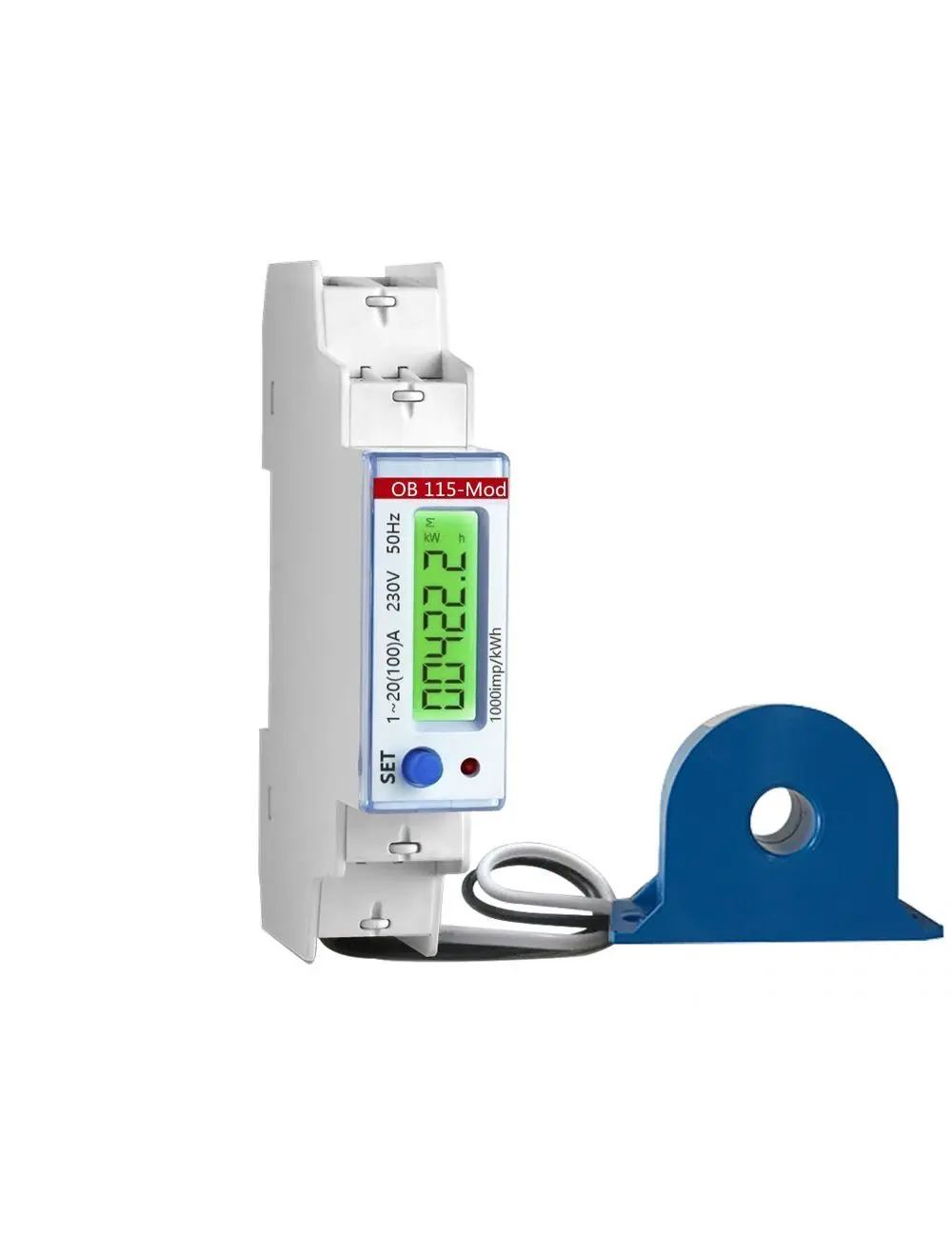 The OB115-MOD (EM115 known as GivEnergy) is a single phase Modbus energy meter with CT clamp, which can be used for direct metering up to 100A. Ideal for PV energy metering, this product offers bi-directional energy measurement and direct/CT connection. The meter features an LCD display with a clear green backlight.