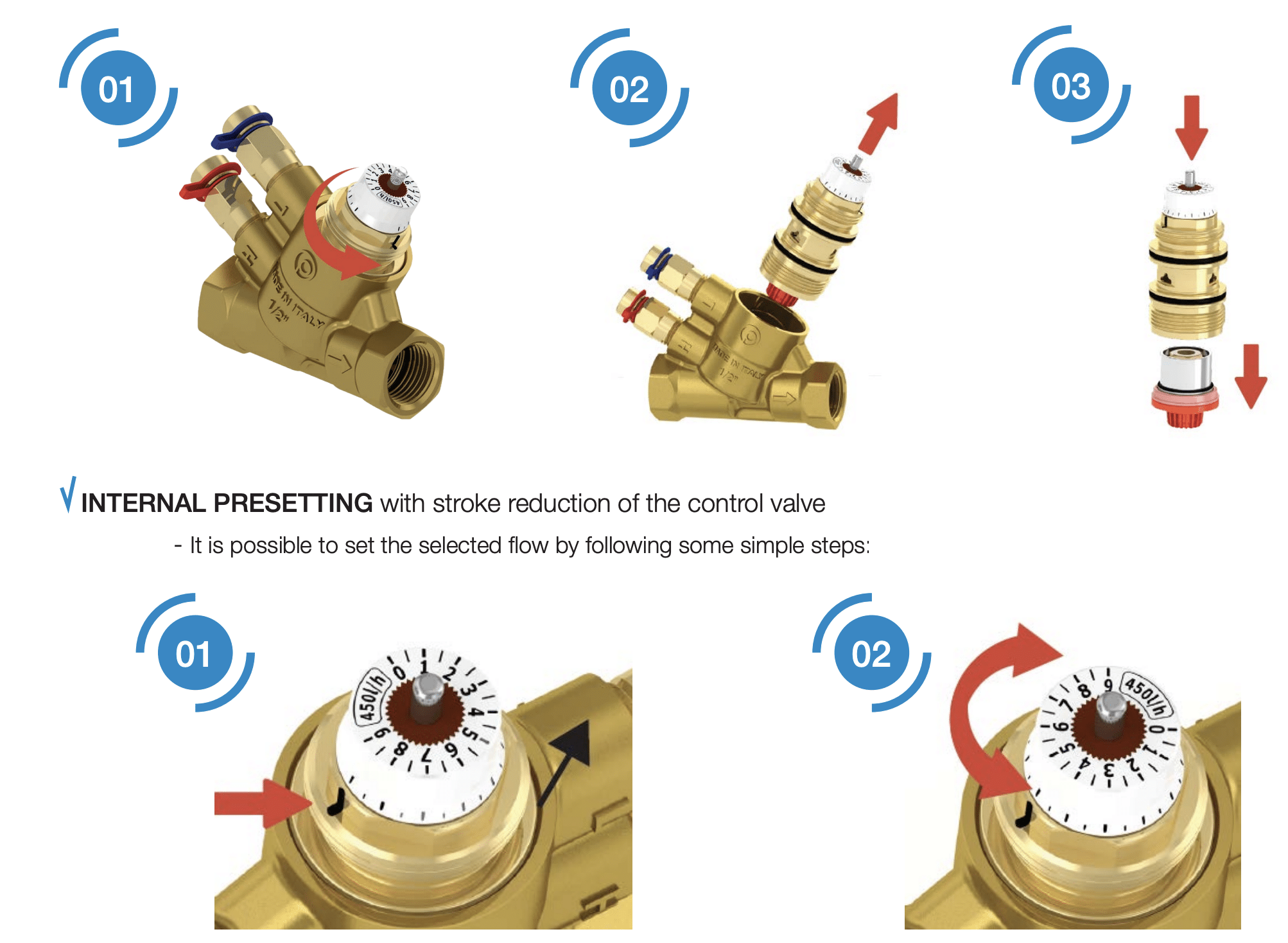The presetting gear can be easily adjusted. It works by varying the control valve stroke.