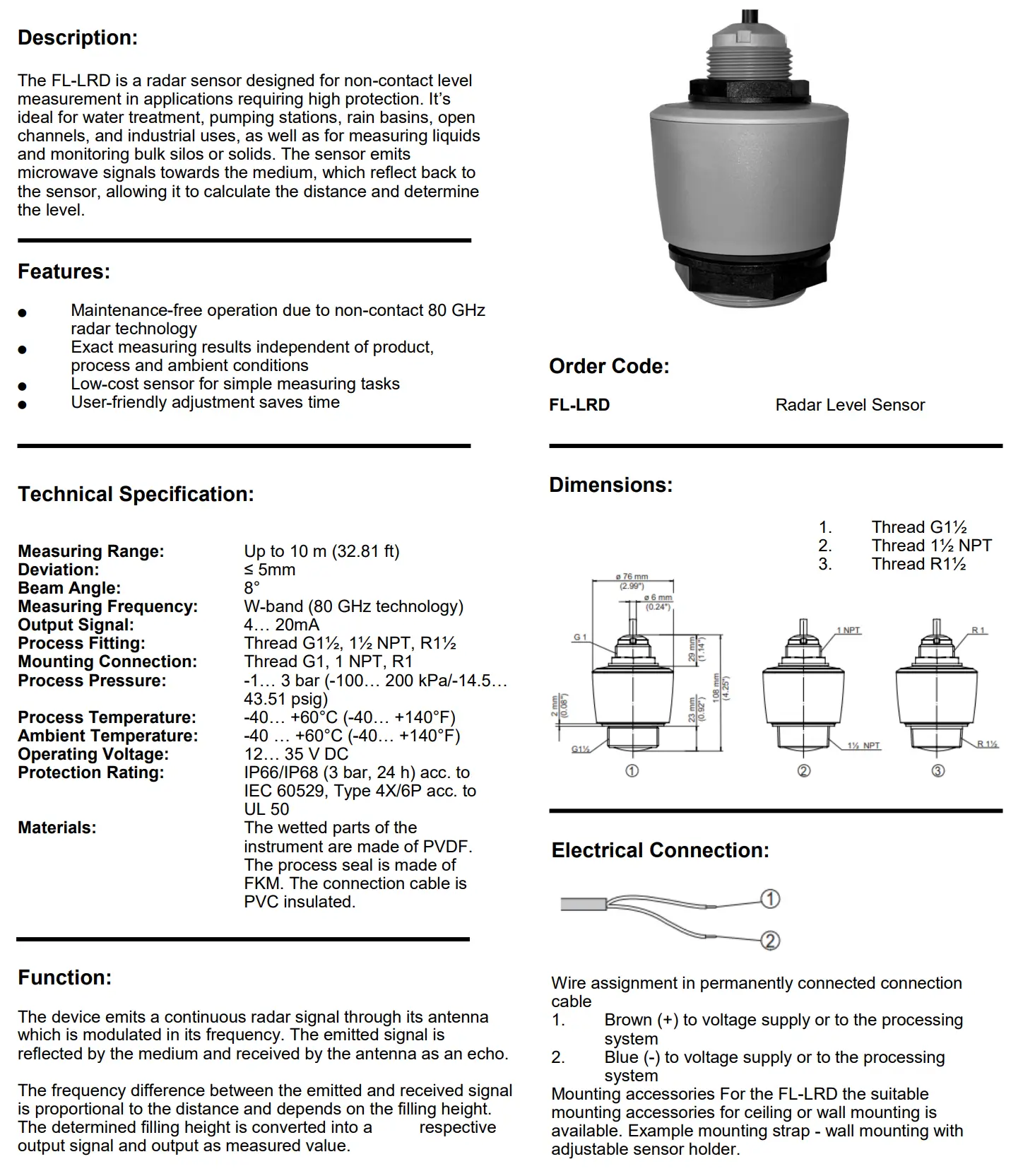 The FL-LRD is a radar sensor designed for non-contact level measurement in applications requiring high protection. It’s ideal for water treatment, pumping stations, rain basins, open channels, and industrial uses, as well as for measuring liquids and monitoring bulk silos or solids. The sensor emits microwave signals towards the medium, which reflect back to the sensor, allowing it to calculate the distance and determine the level.