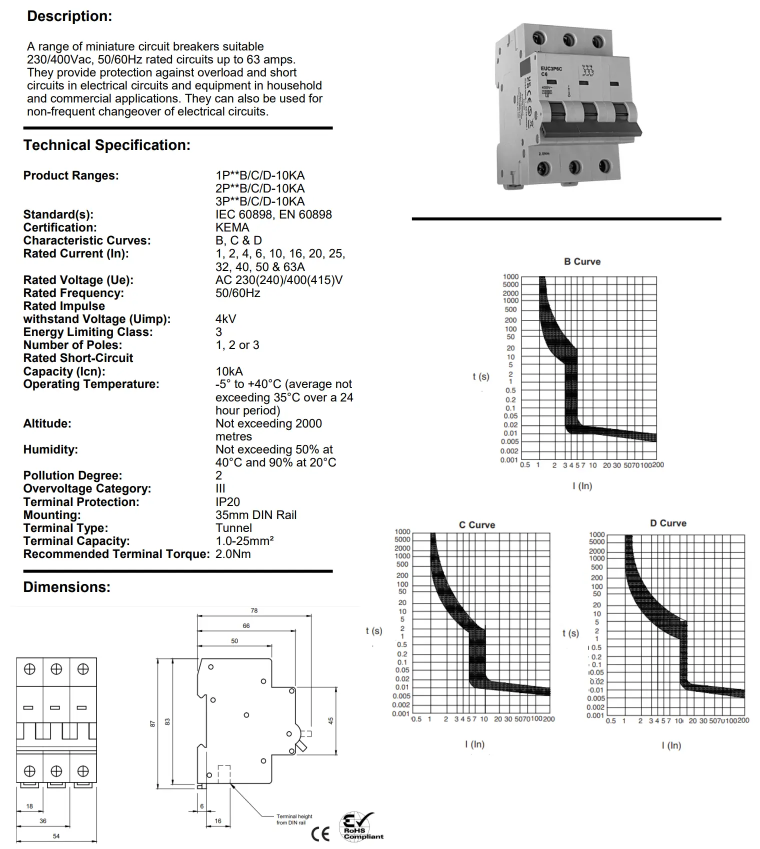 A range of miniature circuit breakers suitable for 230/400Vac, 50/60Hz rated circuits up to 63 amps. They protect against overload and short circuits in electrical circuits and equipment in household and commercial applications. They can also be used for non-frequent changeover of electrical circuits.