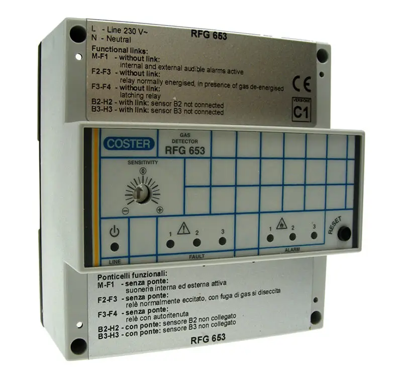 The GLD gas leak detection range is suitable for use in Boiler Rooms and other Commercial applications, providing safety and shut-down functions in the event of gas leakage. Control units are available in 1, 2 or 3 channels for connection to 1, 2 or 3 remote sensors. They are mounted in DIN rail housings, with the option of panel- or wall-mount enclosures. Output relays to operate auxiliary devices such as Solenoid Gas Valves or Sirens, and fault remote signalling are fitted to all units. Power supply is 230VAC or 12-24VDC, and sensors are available for Natural Gas, LPG/Propane, and Carbon Monoxide.