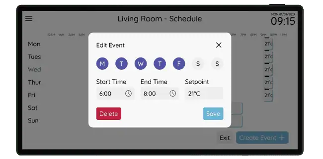 The fully capacitive 7” touch screen offers adjustment of all comfort conditions within a property with flexible time/holiday schedules and combines this with Titan’s smart metering energy platform, displaying current and historical energy usage.