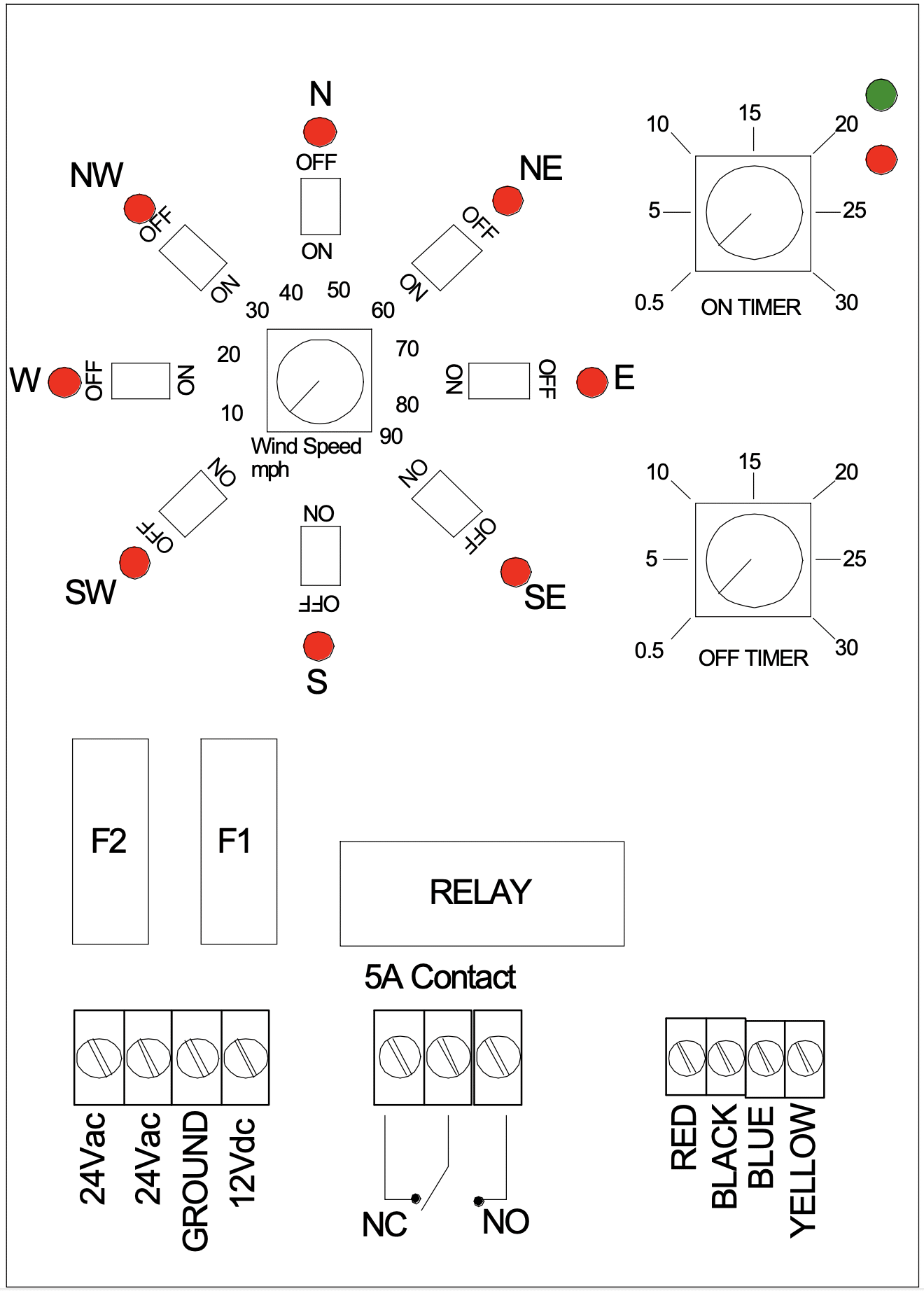 The AV-WSDS is designed to operate from both 24 Vac and 12 Vdc power sources. The controls box is housed in an IP65-rated enclosure with a clear lid, allowing the indicator lights and controls to be easily viewed from the outside. Cable entry to the control box is via three PG7 cable glands, accepting cables between 3 & 6.5mm in diameter. Wind speed to 90mph selectable. Wind direction selectable via 8 DIP switches for each main compass point (N, NE, E, SE, S, SW, W, & NW). On-and-off timers are available to prevent frequent switching caused by unexpected wind gusts, etc.