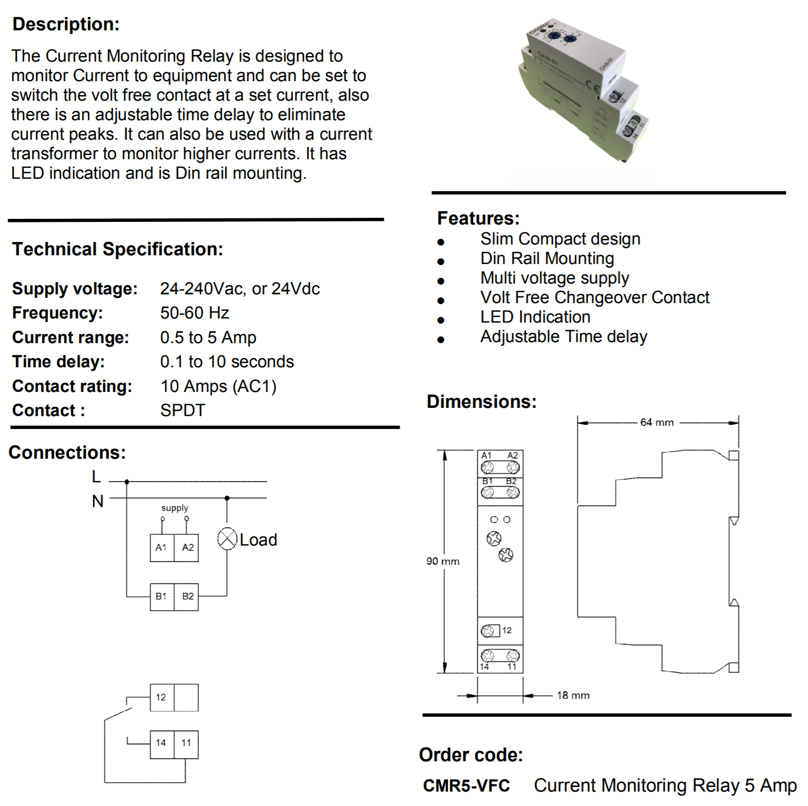 The Current Monitoring Relay is designed to monitor Current to equipment and can be set to switch the volt free contact at a set current, also there is an adjustable time delay to eliminate current peaks. It can also be used with a current transformer to monitor higher currents. It has an LED indication and is Din-rail mounting.