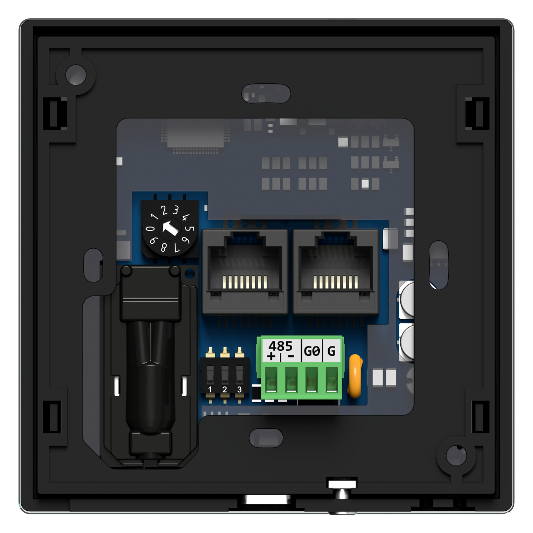 The TouchPoint is factory-equipped with the two most popular open communication protocols, Modbus and BACnet, which are selectable using a DIP switch.