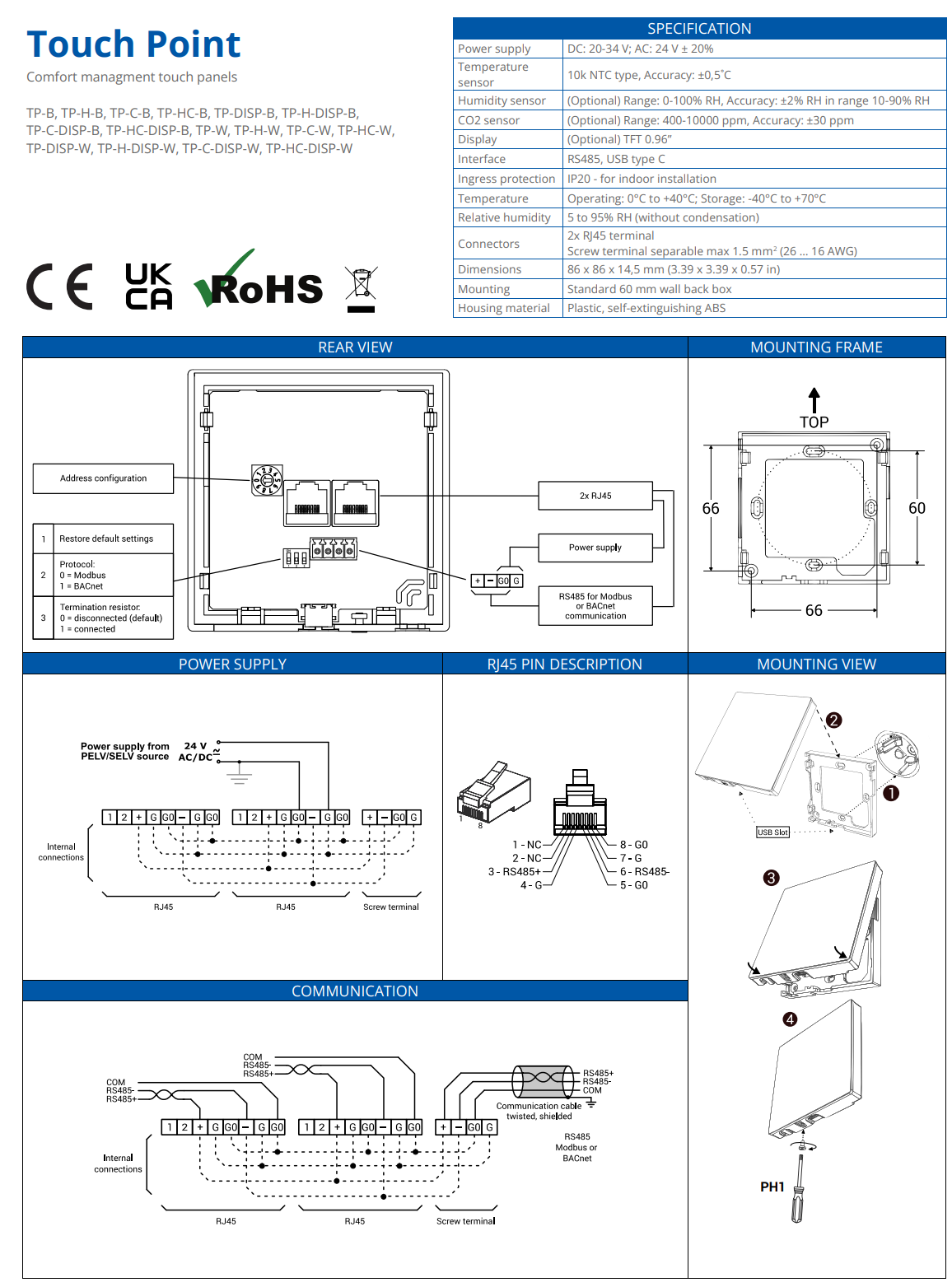Select the colour, sensor type, and display option. The TouchPoint is available in a variety of configurations, to suit your building perfectly. Available with a set of temperature, CO2, and humidity sensors. The TP-HC version is equipped with temperature, humidity, and CO2 sensors.