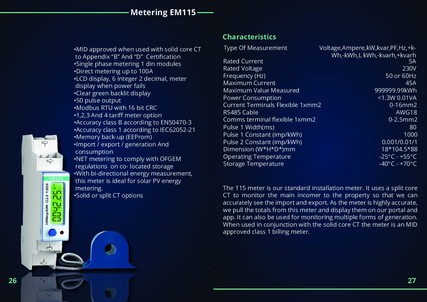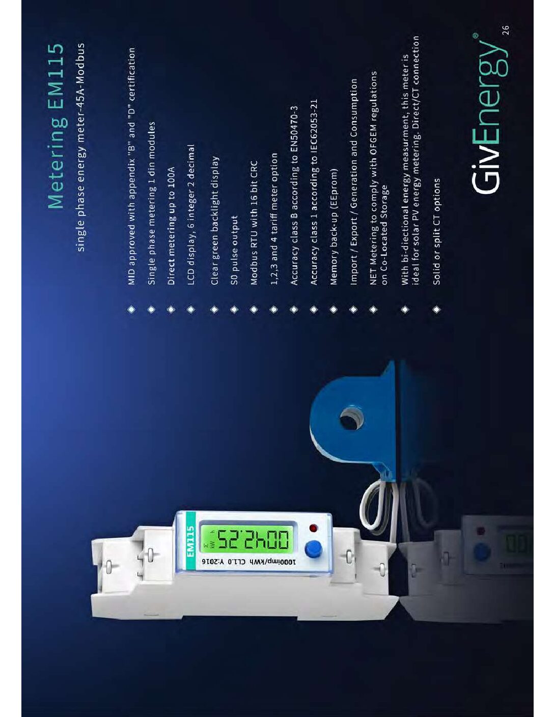 OB115-MOD Meter with CT, also known as the GivEnergy EM115 and the OB115-MOD 100 Amp Single Phase Electric Meter. MID Certified. RS485 Modbus.