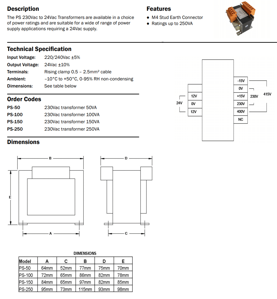 The PS 230Vac to 24Vac Transformers are available in a choice of power ratings and are suitable for a wide range of power supply applications requiring a 24Vac supply.