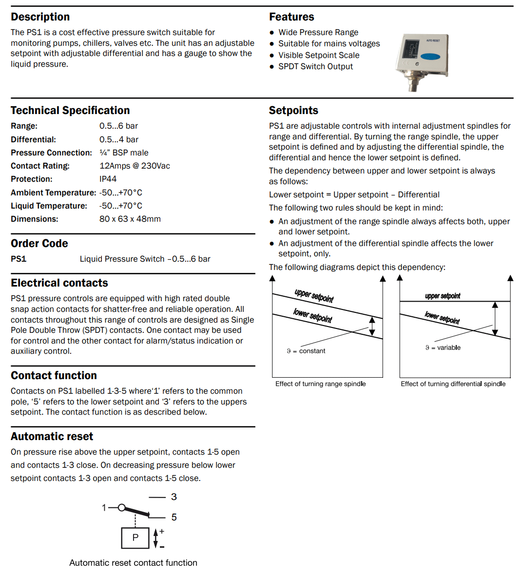 The PS1 is a cost-effective pressure switch suitable for monitoring pumps, chillers, valves, etc. The unit has an adjustable setpoint with adjustable differential and has a gauge to show the liquid pressure.