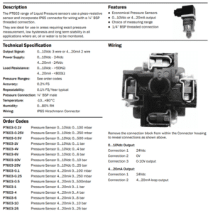 The PT603 range of Liquid Pressure sensors uses a piezo-resistive sensor and incorporates an IP65 connector for wiring with a ¼” BSP threaded connection. They are ideal for use in areas requiring exact pressure measurement, low hysteresis, and long-term stability in all applications where air, oil, or water is to be monitored.