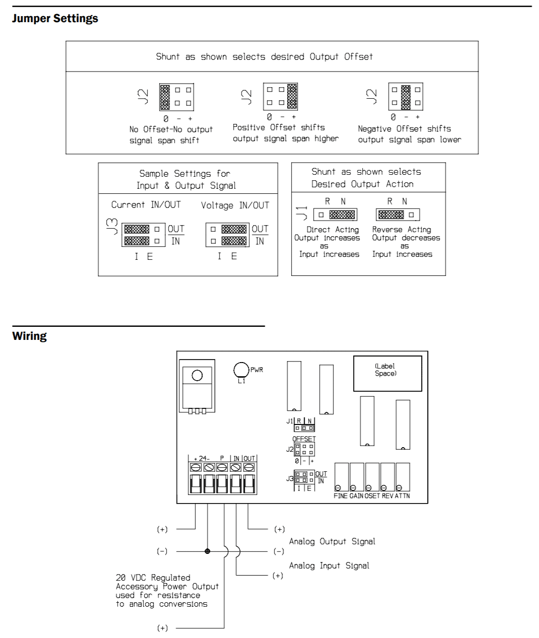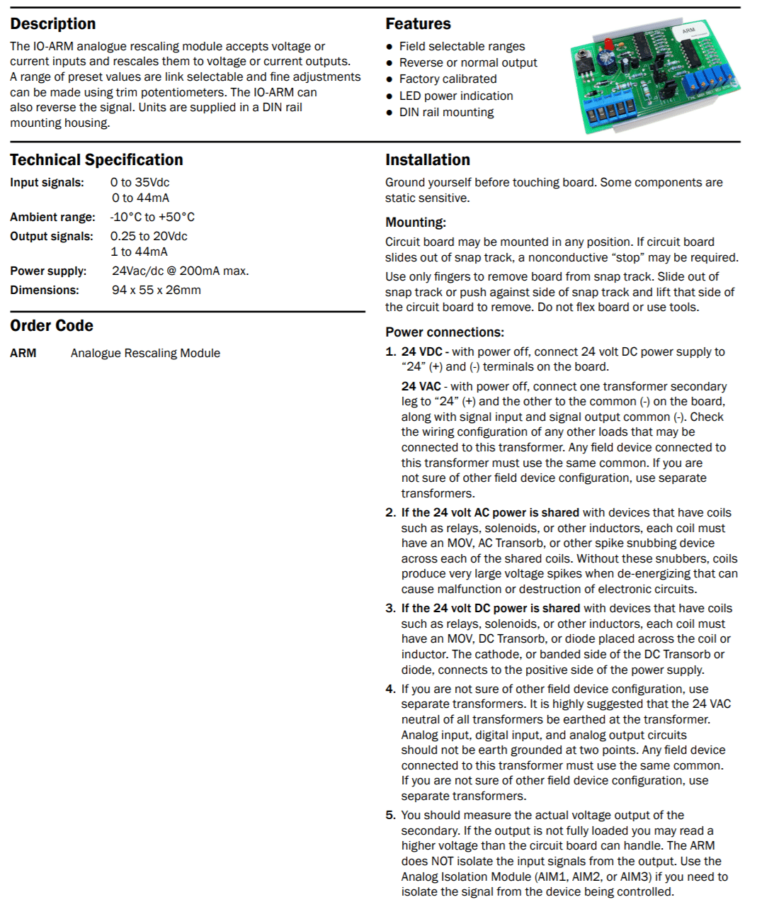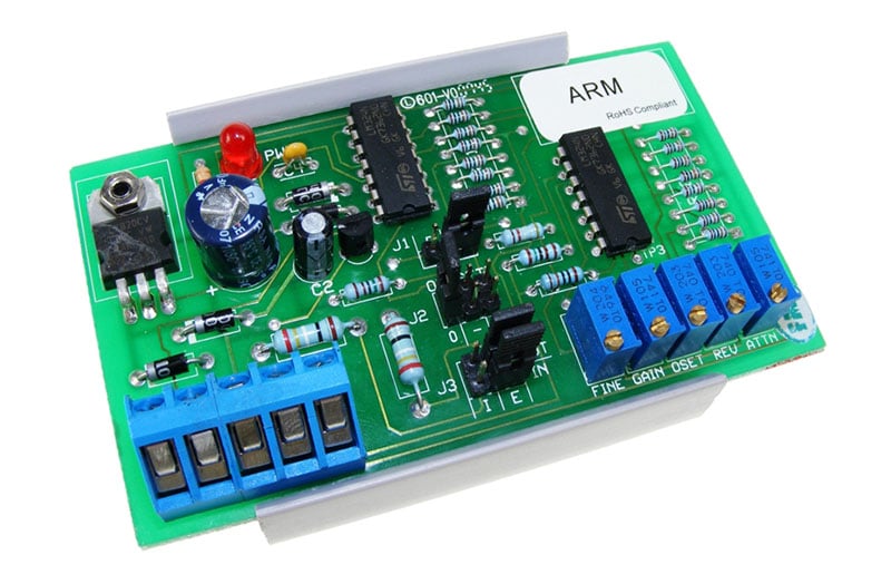 The ARM analogue re-scaling module accepts voltage or current inputs and re-scales them to voltage or current outputs. A range of preset values are link selectable and fine adjustments can be made using trim potentiometers.