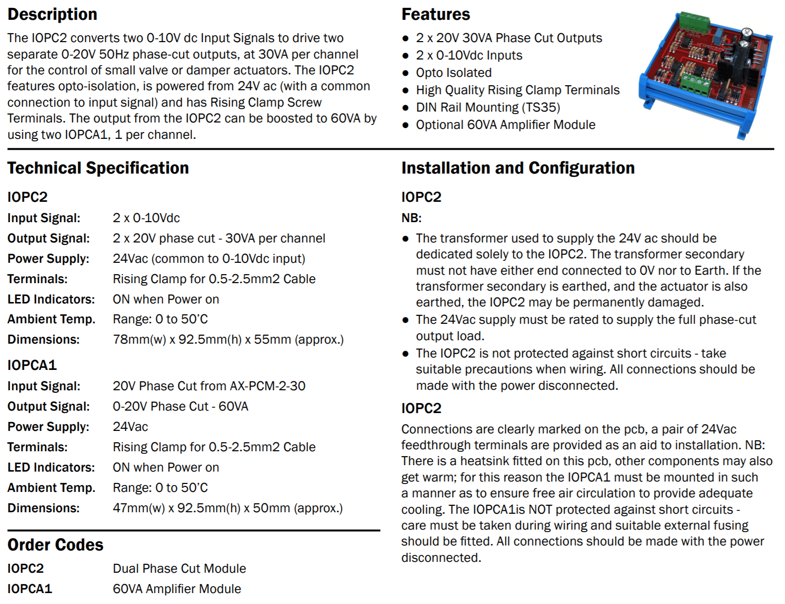 The IOPC2 converts two 0-10V dc Input Signals to drive two separate 0-20V 50Hz phase-cut outputs, at 30VA per channel for the control of small valve or damper actuators.