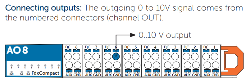 Each channel can be individually configured to generate 0-10V and are short-circuit protected. In the event of a loss of communication between the module and sub-central, the outputs take on the predefined status.