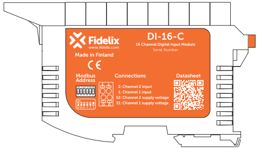 Below you will find a presentation of the Fidelix FdxCompact DI-16-C 16-Channel Digital Input module. How to connect, configure, use, communicate with, and interpret values and signals from the module.
