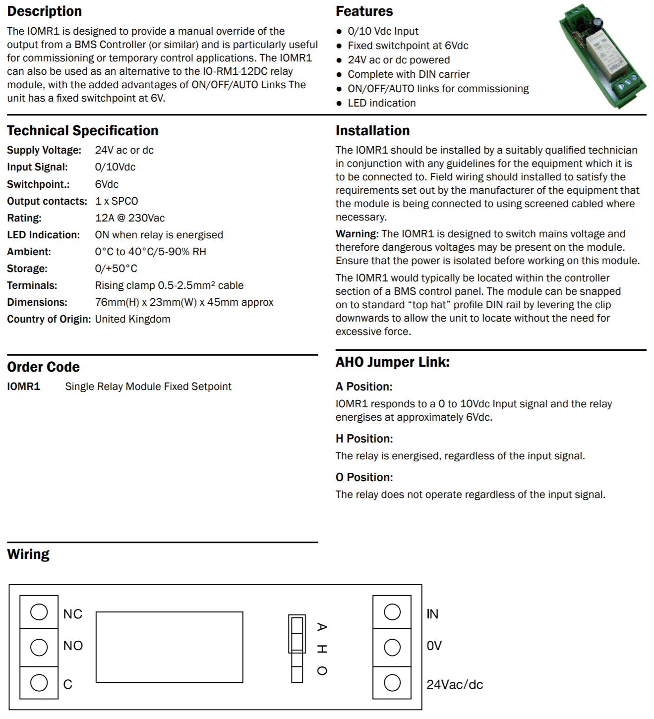 The IOMR1 is designed to provide a manual override of the output from a BMS Controller (or similar) and is particularly useful for commissioning or temporary control applications.