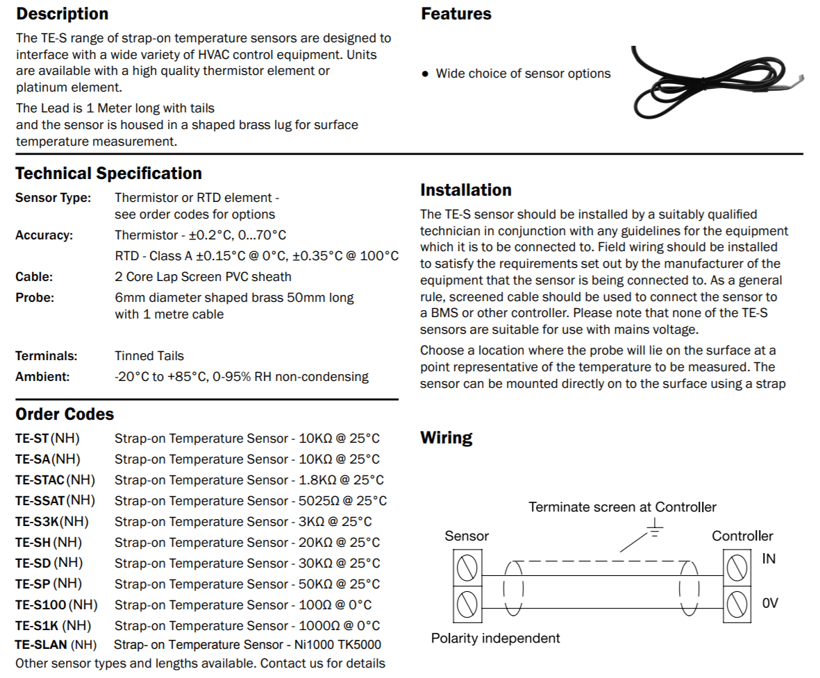 The TE-S range of strap-on temperature sensors is designed to interface with a wide variety of HVAC control equipment. Units are available with a high-quality thermistor element or platinum element. The lead is 1m long with tails and the sensor is housed in a shaped brass lug for surface temperature measurement.