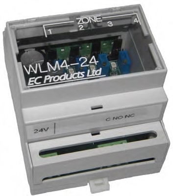 A range of single-zone water leak detection modules in DIN mounting carriers.
